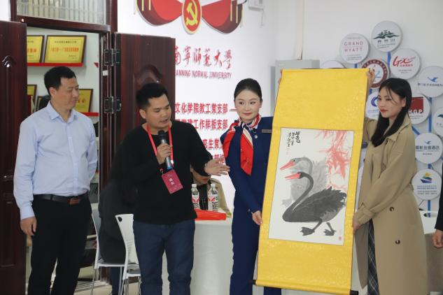 这次回母校,我带了份小礼物。我平时特别爱收藏美术书画作品,旅文不分家,每次带团我都跟贵宾们分享广西的国画山水与民族风情美术作品,游客们都特别爱听这类讲解,这也让我的讲解独树一帜,让客人感觉到不同于其他行程的讲解。这次赠送了一幅来自广西青年美术家韦贵敏(中国美协会员,南宁美协理事,北部湾书画院研究员)的没骨留痕法创作的水墨大鹅,作品不画线,用水墨浓淡来写出鹅毛的层次感。作品上有我的收藏闲章“养正”,“养正书院”来自宾阳南街,主要理念是“养正一个孩子,可以兴旺一个家族;养正千千万万个孩子,可以兴旺一个民族。”。该闲章表达了我当下的主导思想,希望这种理念能传达给更多身边的人。感谢段文军院长等现任旅文学院的领导们给了我一次表达感恩的机会。饮水思源,这份感恩的心,希望能传递给每一位旅文院走出的学子们!