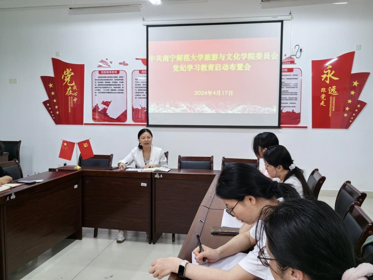 黄珍副书记强调这次党纪学习教育,是加强党的纪律建设、推动全面从严治党向纵深发展的重要举措。要坚持个人自学与集中学习相结合,组织党员特别是党员领导干部逐章逐条学、联系实际学、专题研讨学,真正使学习党纪的过程成为增强纪律意识、提高党性修养的过程,成为学方略、谋创新、抓落实的过程。黄珍副书记指出要做到党委带头学、党支部跟进学、党员对照深入学和纪律党课推动学相结合,党委领导班子成员开展2天党纪学习教育教学读书班,教工、学生党支部以“三会一课”、主题党日为依托,以学习《条例》为主题,通过交流研讨、案例教学、线上培训等方式组织党员认真学习,原原本本学习内容,联系实践推动工作,凝聚人心。全体党员要牢记党纪国法不可逾越,底线红线不可触碰,只有遵规守纪,才能方得始终。要巩固拓展主题教育成果,通过党纪学习教育,扎实推动学院高质量发展,为广西旅游发展提供智力支持,同推动清廉学校建设取得更大成效,为教师教育国内一流、服务发展贡献卓著、辐射东盟影响广泛的高水平师范大学建设提供坚强保障。