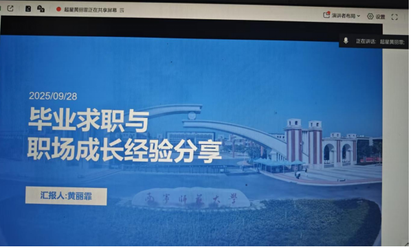现任超星泛雅集团大客户销售黄丽霏优秀校友结合自身从“南师学子”到“职场人”的成长历程,分别从“求职准备”“职场起步与深耕”两大维度分享就业经验,鼓励学弟学妹打破地域限制、树立“积极就业、理性择业”“先就业再择业”的观念。