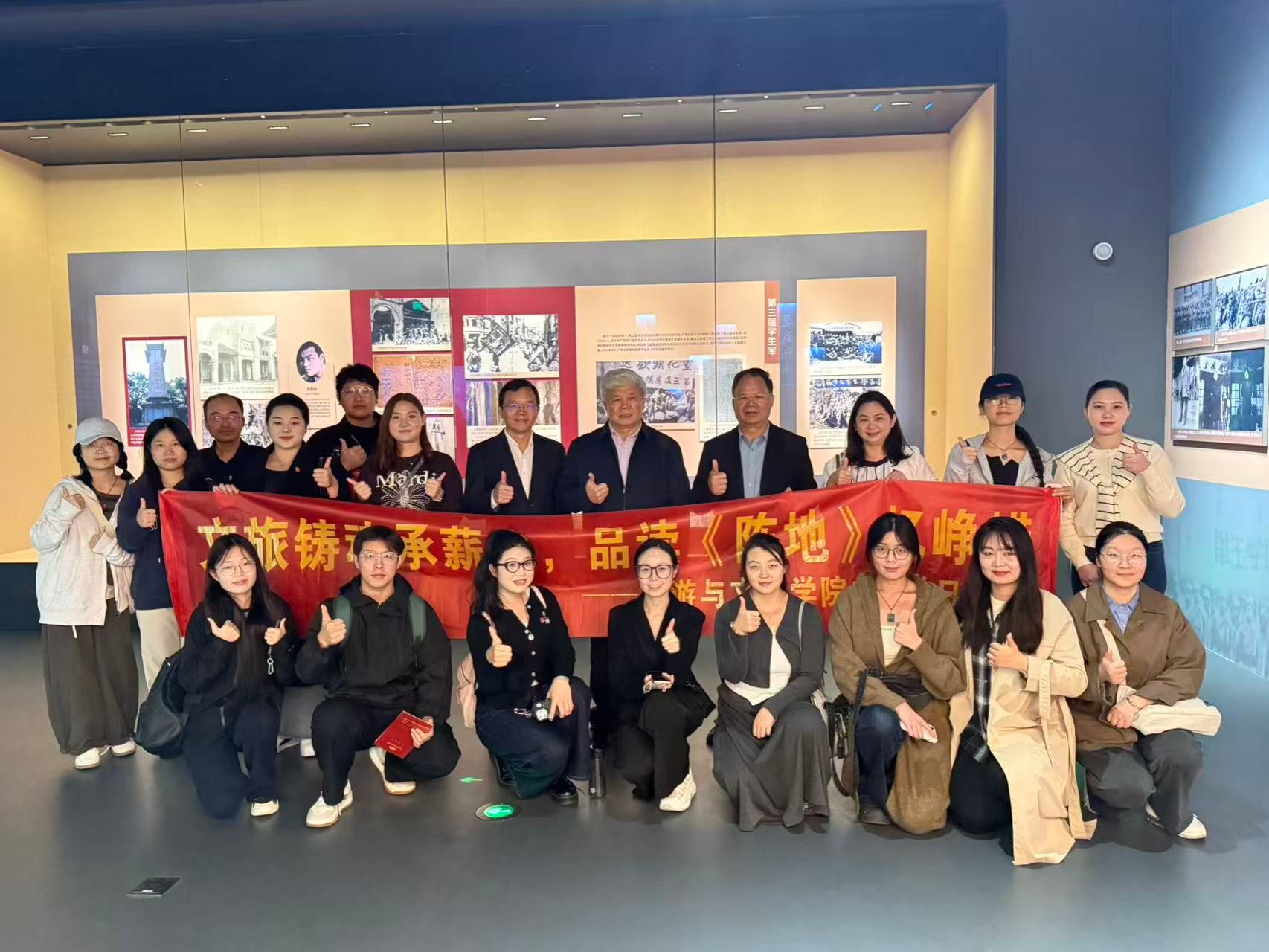 新书分享会,学院教工党支部书记甘政作为学院代表,接受了《阵地》新书捐赠,为学院红色文化育人增添了宝贵的精神教材。会后,师生党员走进广西壮族自治区博物馆“精神的阵地——广西文化抗战特展”展厅。展厅内,《救亡日报》复刻版、抗战时期文艺演出海报、文化界人士手稿等珍贵文物,与书中记载的历史情节相互呼应、互为印证,让抽象的历史变得可感可触。在“全民抗战”主题展区前,师生们驻足良久,认真聆听讲解、交流感悟,深切体会到文化抗战在凝聚民族精神、助力全民抗战中的重要作用。观展中,学院党员师生还非常荣幸地与中国著名出版家、作家、原中国出版集团公司总裁聂震宁先生以及广西师范大学出版社领导共同交流、合影。