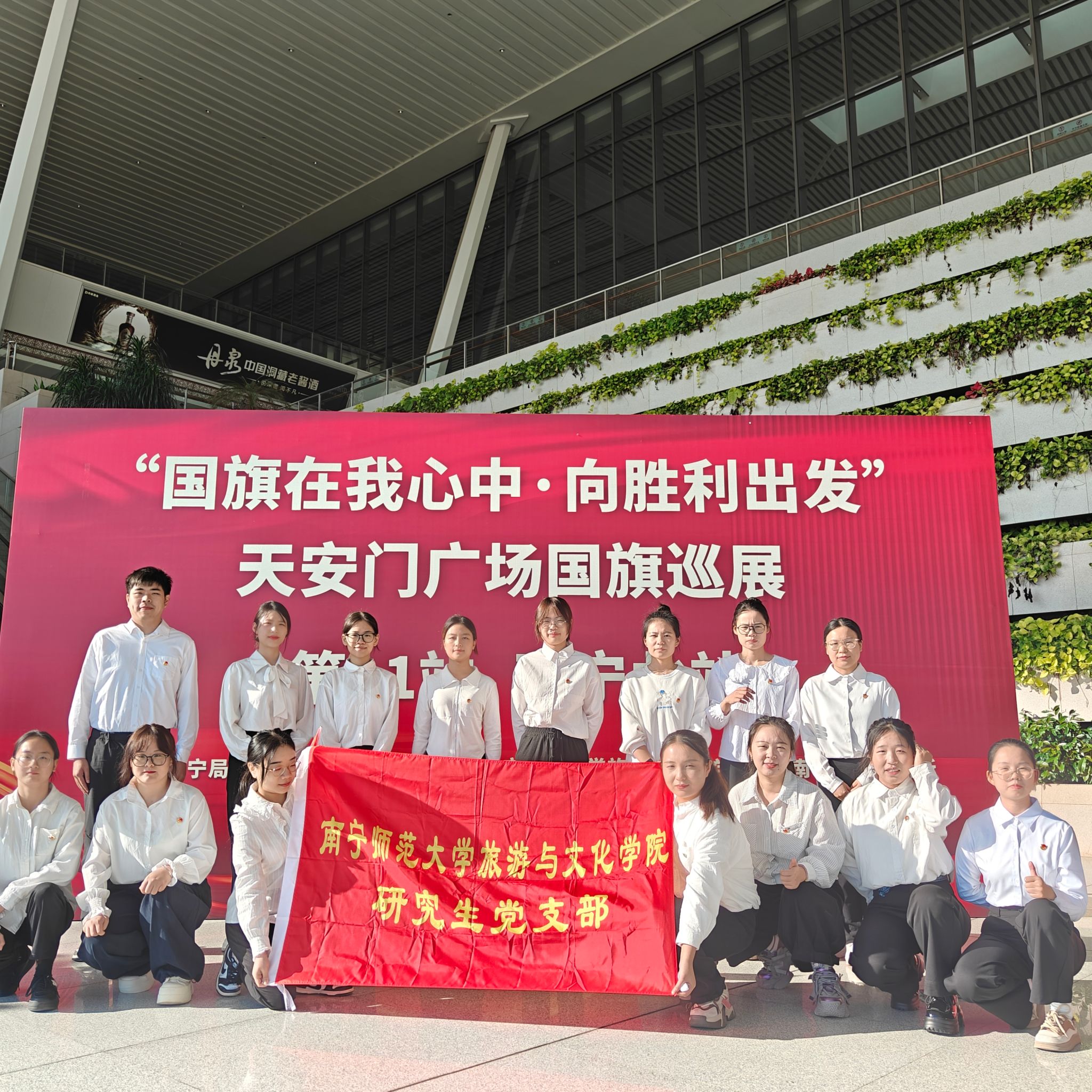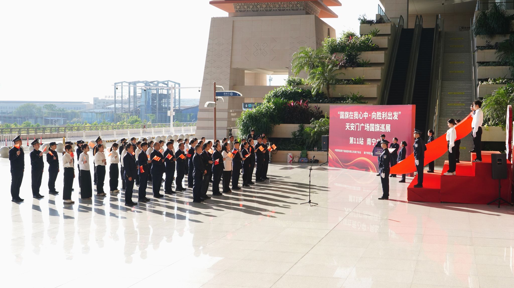 为深入学习贯彻党的二十届四中全会精神,厚植研究生党员爱国主义情怀,强化党建联盟单位协同育人实效,11月14日上午,bw必威西汉姆联党委副书记黄珍、研究生党支部书记陈春容带领支部成员,赴南宁北站落客平台,与南宁车站、南宁北站派出所等党建联盟单位共同参与“国旗在我心中——向胜利出发”天安门广场国旗巡展第11站(南宁北站)爱国主义教育活动,在庄重仪式与深度互动中传承红色基因,凝聚旅文学子奋进力量。